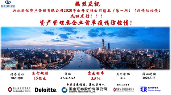 2020年3月17日,兴业国信资产管理有限公司(以下简称“兴业国信资管”或“公司”)在上海证券交易所面向合格投资者成功发行2020年公开发行公司债券(第一期)(疫情防控债),本次债券由国金证券股份有限公司作为牵头主承销商、簿记管理人和受托管理人,兴业证券股份有限公司作为联席主承销商,发行规模15亿元,主体评级AAA,债券期限3+2年。本期债券也为国内资本市场上资产管理类企业首单疫情防控债。